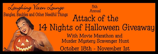Visit the Laughing Vixen Lounge blog daily during the giveaway for the Halloween Movie Marathon. Test your movie knowledge with the Guess the Movie Game. Then try to solve the Murder Mystery Scavenger Hunt, if you dare! Each event will get you daily entries in the giveaway plus a special giveaway for the Scavenger Hunt. Find full details for these events HERE.